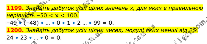 1199. Знайдіть добуток усіх цілих значень х, для яких є правильною нерівність –50 < х < 100. –49 • (–48) • … • 0 • 1 • 2 … • 99 = 0. 1200. Знайдіть добуток усіх цілих чисел, модулі яких менші від 25. 24 • 23 • … • 0 = 0.