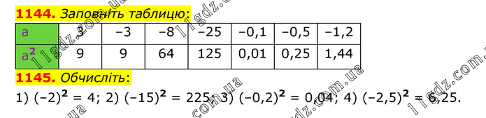 1145. Обчисліть: 1) (–2)2 = 4; 2) (–15)2 = 225; 3) (–0,2)2 = 0,04; 4) (–2,5)2 = 6,25.
