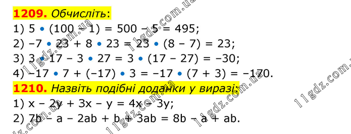 1209. Обчисліть: 1) 5 • (100 – 1) = 500 – 5 = 495; 2) –7 • 23 + 8 • 23 = 23 • (8 – 7) = 23; 3) 3 • 17 – 3 • 27 = 3 • (17 – 27) = –30; 4) –17 • 7 + (–17) • 3 = –17 • (7 + 3) = –170. 1210. Назвіть подібні доданки у виразі: 1) х – 2у + Зх – у = 4x – 3y; 2) 7b – а – 2ab + b + 3ab = 8b – a + ab.