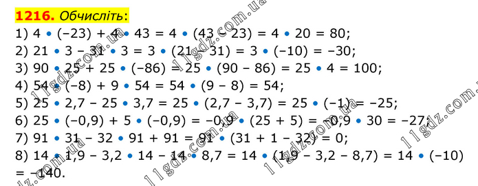 Обчисліть: 1) 4 • (–23) + 4 • 43 = 4 • (43 – 23) = 4 • 20 = 80; 2) 21 • 3 – 31 • 3 = 3 • (21 – 31) = 3 • (–10) = –30; 3) 90 • 25 + 25 • (–86) = 25 • (90 – 86) = 25 • 4 = 100; 4) 54 • (–8) + 9 • 54 = 54 • (9 – 8) = 54; 5) 25 • 2,7 – 25 • 3,7 = 25 • (2,7 – 3,7) = 25 • (–1) = –25; 6) 25 • (–0,9) + 5 • (–0,9) = –0,9 • (25 + 5) = –0,9 • 30 = –27; 7) 91 • 31 – 32 • 91 + 91 = 91 • (31 + 1 – 32) = 0; 8) 14 • 1,9 – 3,2 • 14 – 14 • 8,7 = 14 • (1,9 – 3,2 – 8,7) = 14 • (–10) = –140.