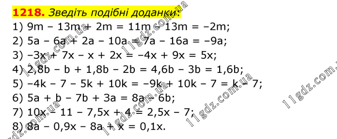 Зведіть подібні доданки: 1) 9m – 13m + 2m = 11m – 13m = –2m; 2) 5а – 6а + 2а – 10а = 7a – 16a = –9a; 3) –Зх + 7х – х + 2х = –4x + 9x = 5x; 4) 2,8b – b + 1,8b – 2b = 4,6b – 3b = 1,6b; 5) –4k – 7 – 5k + 10k = –9k + 10k – 7 = k – 7; 6) 5а + b – 7b + За = 8a – 6b; 7) 10x – 11 – 7,5x + 4 = 2,5x – 7; 8) 8а – 0,9x – 8а + х = 0,1x.