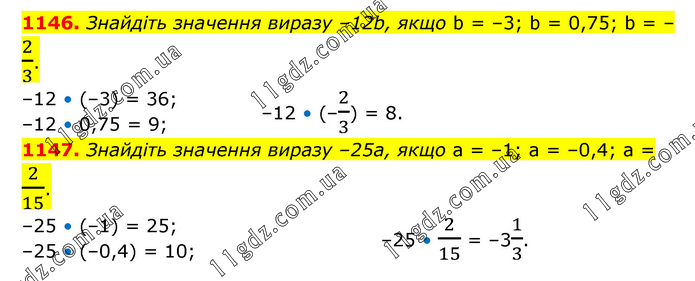 1146. Знайдіть значення виразу –12b, якщо b = –3; b = 0,75; b = –2/3. –12 • (–3) = 36; –12 • 0,75 = 9; –12 • (–2/3) = 8. 1147. Знайдіть значення виразу –25а, якщо а = –1; а = –0,4; а = 2/15. –25 • (–1) = 25; –25 • (–0,4) = 10; –25 • 2/15 = –31/3.