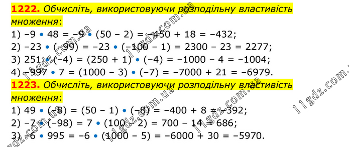 1222. Обчисліть, використовуючи розподільну властивість множення: 1) –9 • 48 = –9 • (50 – 2) = –450 + 18 = –432; 2) –23 • (–99) = –23 • (–100 – 1) = 2300 – 23 = 2277; 3) 251 • (–4) = (250 + 1) • (–4) = –1000 – 4 = –1004; 4) –997 • 7 = (1000 – 3) • (–7) = –7000 + 21 = –6979. 1223. Обчисліть, використовуючи розподільну властивість множення: 1) 49 • (–8) = (50 – 1) • (–8) = –400 + 8 = –392; 2) –7 • (–98) = 7 • (100 – 2) = 700 – 14 = 686; 3) –6 • 995 = –6 • (1000 – 5) = –6000 + 30 = –5970.