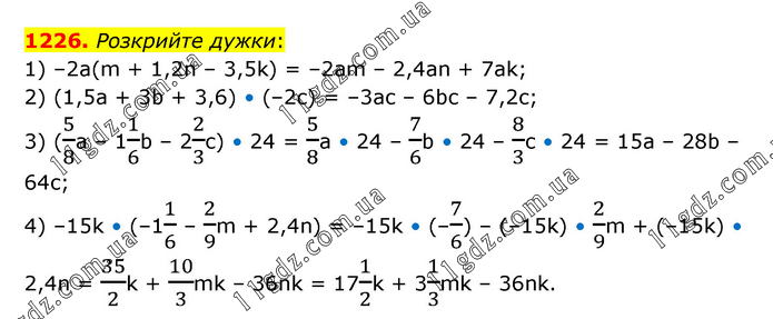 Розкрийте дужки: 1) –2a(m + 1,2n – 3,5k) = –2am – 2,4an + 7ak; 2) (1,5a + 3b + 3,6) • (–2c) = –3ac – 6bc – 7,2c; 3) (5/8a – 11/6b – 22/3c) • 24 = 5/8a • 24 – 7/6b • 24 – 8/3c • 24 = 15a – 28b – 64c; 4) –15k • (–11/6 – 2/9m + 2,4n) = –15k • (–7/6) – (–15k) • 2/9m + (–15k) • 2,4n = 35/2k + 10/3mk – 36nk = 171/2k + 31/3mk – 36nk.