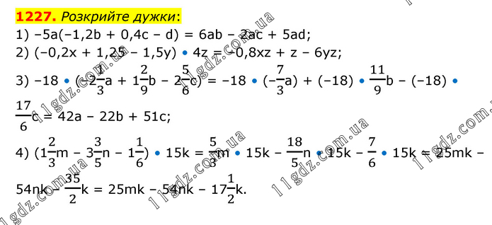 Розкрийте дужки: 1) –5a(–1,2b + 0,4c – d) = 6ab – 2ac + 5ad; 2) (–0,2x + 1,25 – 1,5y) • 4z = –0,8xz + z – 6yz; 3) –18 • (–21/3a + 12/9b – 25/6c) = –18 • (–7/3a) + (–18) • 11/9b – (–18) • 17/6c = 42a – 22b + 51c; 4) (12/3m – 33/5n – 11/6) • 15k = 5/3m • 15k – 18/5n • 15k – 7/6 • 15k = 25mk – 54nk – 35/2k = 25mk – 54nk – 171/2k.