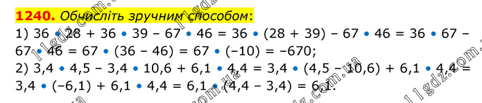 Обчисліть зручним способом: 1) 36 • 28 + 36 • 39 – 67 • 46 = 36 • (28 + 39) – 67 • 46 = 36 • 67 – 67 • 46 = 67 • (36 – 46) = 67 • (–10) = –670; 2) 3,4 • 4,5 – 3,4 • 10,6 + 6,1 • 4,4 = 3,4 • (4,5 – 10,6) + 6,1 • 4,4 = 3,4 • (–6,1) + 6,1 • 4,4 = 6,1 • (4,4 – 3,4) = 6,1.
