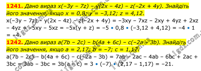1241. Дано вираз х(–3у – 7z) – у(2х – 4z) – z(–2x + 4у). Знайдіть його значення, якщо х = 0,8; у = –3,12; z = 4,12. х(–3у – 7z) – у(2х – 4z) – z(–2x + 4у) = –3xy – 7xz – 2xy + 4yz + 2xz – 4yz = –5xy – 5xz = –5x(y + z) = –5 • 0,8 • (–3,12 + 4,12) = –4 • 1 = –4. 1242. Дано вираз а(7b – 2с) – b(4а + 6с) – с(–2а – Зb). Знайдіть його значення, якщо а = 2,17; b = –7; с = 1,17. а(7b – 2с) – b(4а + 6с) – с(–2а – Зb) = 7ab – 2ac – 4ab – 6bc + 2ac + 3bc = 3ab – 3bc = 3b(a – c) = 3 • (–7) • (2,17 – 1,17) = –21.