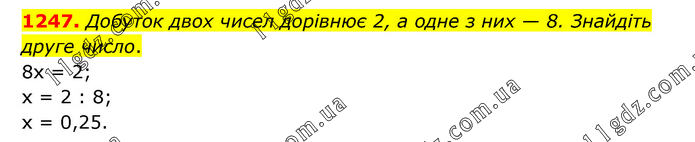 Добуток двох чисел дорівнює 2, а одне з них — 8. Знайдіть друге число. 8х = 2; х = 2 : 8; х = 0,25.