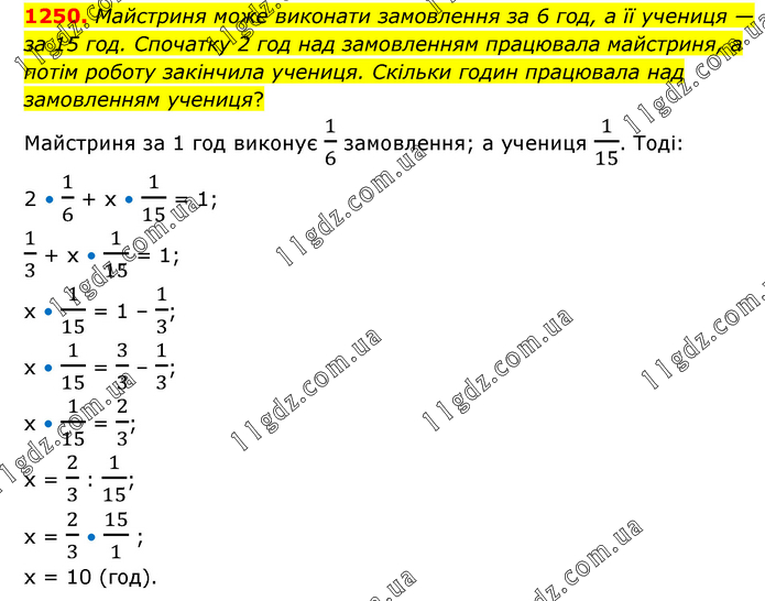 Майстриня може виконати замовлення за 6 год, а її учениця — за 15 год. Спочатку 2 год над замовленням працювала майстриня, а потім роботу закінчила учениця. Скільки годин працювала над замовленням учениця? Майстриня за 1 год виконує 1/6 замовлення; а учениця 1/15. Тоді: 2 • 1/6 + х • 1/15 = 1; 1/3 + х • 1/15 = 1; х • 1/15 = 1 – 1/3; х • 1/15 = 3/3 – 1/3; х • 1/15 = 2/3; х = 2/3 : 1/15; х = 2/3 • 15/1 ; х = 10 (год).