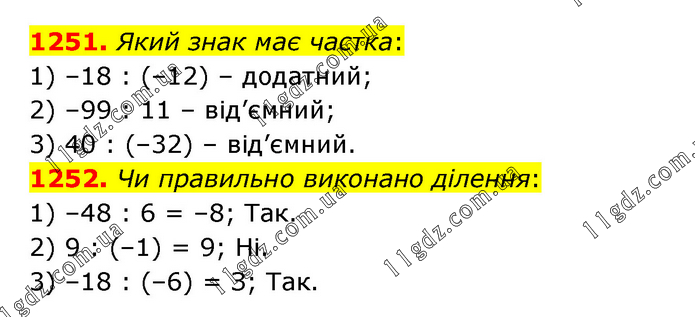 1251. Який знак має частка: 1) –18 : (–12) – додатний; 2) –99 : 11 – від’ємний; 3) 40 : (–32) – від’ємний. 1252. Чи правильно виконано ділення: 1) –48 : 6 = –8; Так. 2) 9 : (–1) = 9; Ні. 3) –18 : (–6) = З; Так.