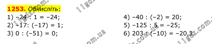 Обчисліть: 1) –24 : 1 = –24; 2) –17: (–17) = 1; 3) 0 : (–51) = 0; 4) –40 : (–2) = 20; 5) –125 : 5 = –25; 6) 203 : (–10) = –20,3.