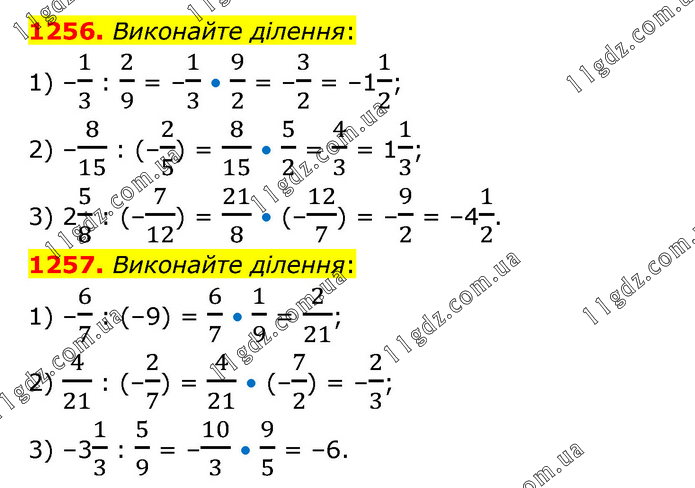 1256. Виконайте ділення: 1) –1/3 : 2/9 = –1/3 • 9/2 = –3/2 = –11/2; 2) –8/15 : (–2/5) = 8/15 • 5/2 = 4/3 = 11/3; 3) 25/8 : (–7/12) = 21/8 • (–12/7) = –9/2 = –41/2. 1257. Виконайте ділення: 1) –6/7 : (–9) = 6/7 • 1/9 = 2/21; 2) 4/21 : (–2/7) = 4/21 • (–7/2) = –2/3; 3) –31/3 : 5/9 = –10/3 • 9/5 = –6.