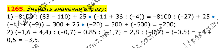 Знайдіть значення виразу: 1) –8100 : (83 – 110) + 25 • (–11 + 36 : (–4)) = –8100 : (–27) + 25 • (–11 + (–9)) = 300 + 25 • (–20) = 300 + (–500) = –200; 2) (–1,6 + 4,4) : (–0,7) – 0,85 : (–1,7) = 2,8 : (–0,7) – (–0,5) = –4 + 0,5 = –3,5.