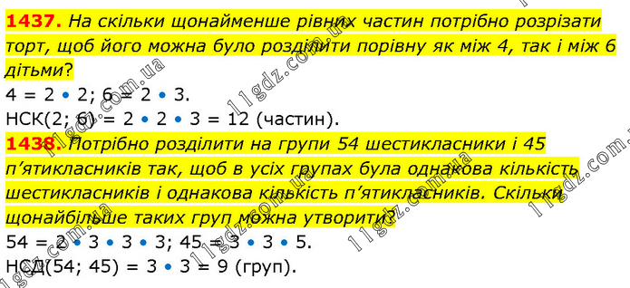 1437. На скільки щонайменше рівних частин потрібно розрізати торт, щоб його можна було розділити порівну як між 4, так і між 6 дітьми? 4 = 2 • 2; 6 = 2 • 3. НСК(2; 6) = 2 • 2 • 3 = 12 (частин). 1438. Потрібно розділити на групи 54 шестикласники і 45 п’ятикласників так, щоб в усіх групах була однакова кількість шестикласників і однакова кількість п’ятикласників. Скільки щонайбільше таких груп можна утворити? 54 = 2 • 3 • 3 • 3; 45 = 3 • 3 • 5. НСД(54; 45) = 3 • 3 = 9 (груп).