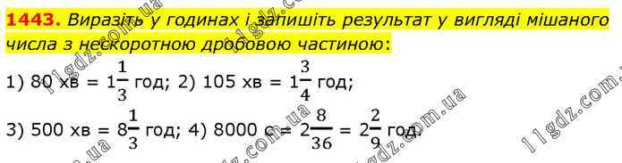 Виразіть у годинах і запишіть результат у вигляді мішаного числа з нескоротною дробовою частиною: 1) 80 хв = 11/3 год; 2) 105 хв = 13/4 год; 3) 500 хв = 81/3 год; 4) 8000 с = 28/36 = 22/9 год.