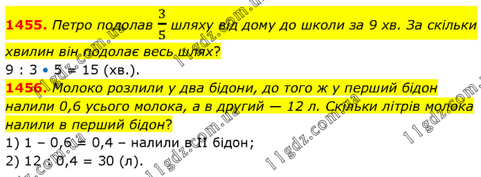 1455. Петро подолав 3/5 шляху від дому до школи за 9 хв. За скільки хвилин він подолає весь шлях? 9 : 3 • 5 = 15 (хв.). 1456. Молоко розлили у два бідони, до того ж у перший бідон налили 0,6 усього молока, а в другий — 12 л. Скільки літрів молока налили в перший бідон? 1) 1 – 0,6 = 0,4 – налили в ІІ бідон; 2) 12 : 0,4 = 30 (л).