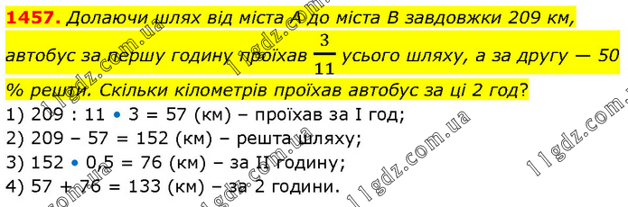 Долаючи шлях від міста А до міста В завдовжки 209 км, автобус за першу годину проїхав 3/11 усього шляху, а за другу — 50 % решти. Скільки кілометрів проїхав автобус за ці 2 год? 1) 209 : 11 • 3 = 57 (км) – проїхав за І год; 2) 209 – 57 = 152 (км) – решта шляху; 3) 152 • 0,5 = 76 (км) – за ІІ годину; 4) 57 + 76 = 133 (км) – за 2 години.