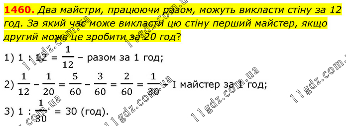 Два майстри, працюючи разом, можуть викласти стіну за 12 год. За який час може викласти цю стіну перший майстер, якщо другий може це зробити за 20 год? 1) 1 : 12 = 1/12 – разом за 1 год; 2) 1/12 – 1/20 = 5/60 – 3/60 = 2/60 = 1/30 – І майстер за 1 год; 3) 1 : 1/30 = 30 (год).