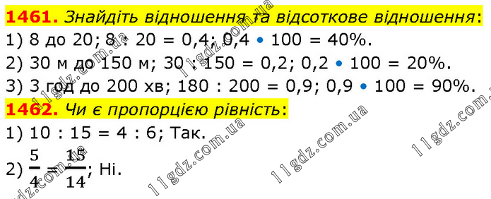 1461. Знайдіть відношення та відсоткове відношення: 1) 8 до 20; 8 : 20 = 0,4; 0,4 • 100 = 40%. 2) 30 м до 150 м; 30 : 150 = 0,2; 0,2 • 100 = 20%. 3) 3 год до 200 хв; 180 : 200 = 0,9; 0,9 • 100 = 90%. 1462. Чи є пропорцією рівність: 1) 10 : 15 = 4 : 6; Так. 2) 5/4 = 15/14; Ні.