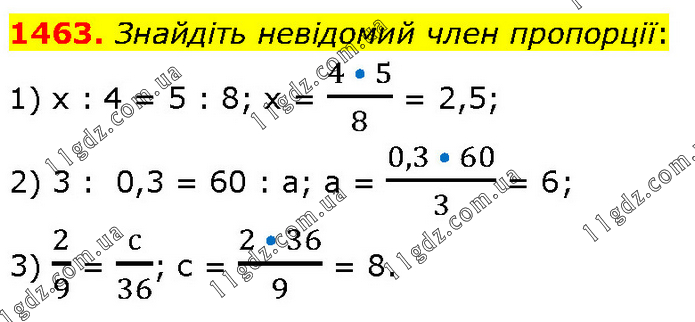 Знайдіть невідомий член пропорції: 1) х : 4 = 5 : 8; х = (4 • 5)/8 = 2,5; 2) 3 : 0,3 = 60 : а; а = (0,3 • 60)/3 = 6; 3) 2/9 = с/36; с = (2 • 36)/9 = 8.