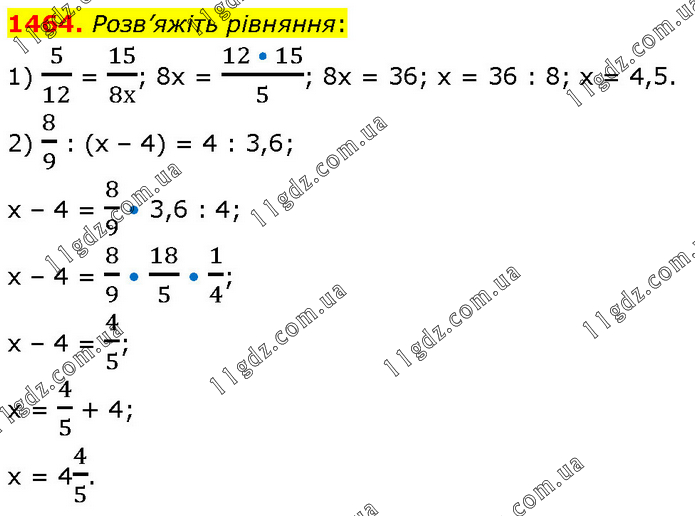 Розв’яжіть рівняння: 1) 5/12 = 15/8х; 8х = (12 • 15)/5; 8х = 36; х = 36 : 8; х = 4,5. 2) 8/9 : (х – 4) = 4 : 3,6; х – 4 = 8/9 • 3,6 : 4; х – 4 = 8/9 • 18/5 • 1/4; х – 4 = 4/5; х = 4/5 + 4; х = 44/5.