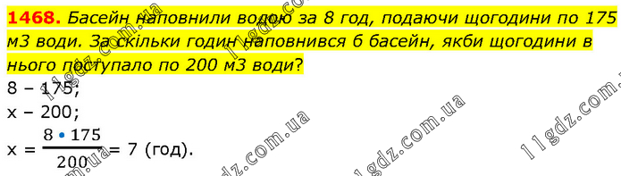 Басейн наповнили водою за 8 год, подаючи щогодини по 175 м3 води. За скільки годин наповнився б басейн, якби щогодини в нього поступало по 200 м3 води? 8 – 175; х – 200; х = (8 • 175)/200 = 7 (год).