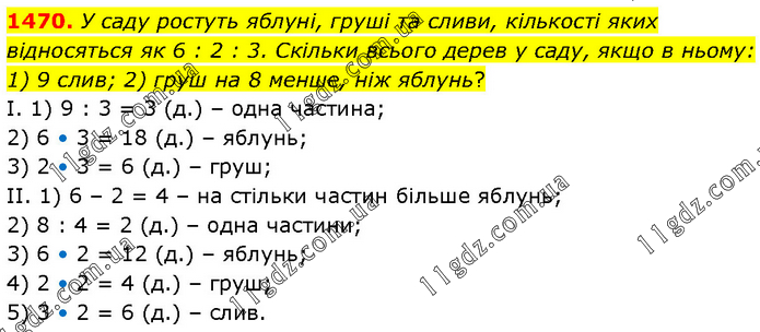 У саду ростуть яблуні, груші та сливи, кількості яких відносяться як 6 : 2 : 3. Скільки всього дерев у саду, якщо в ньому: 1) 9 слив; 2) груш на 8 менше, ніж яблунь? І. 1) 9 : 3 = 3 (д.) – одна частина; 2) 6 • 3 = 18 (д.) – яблунь; 3) 2 • 3 = 6 (д.) – груш; ІІ. 1) 6 – 2 = 4 – на стільки частин більше яблунь; 2) 8 : 4 = 2 (д.) – одна частини; 3) 6 • 2 = 12 (д.) – яблунь; 4) 2 • 2 = 4 (д.) – груш; 5) 3 • 2 = 6 (д.) – слив.