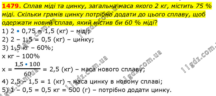 Сплав міді та цинку, загальна маса якого 2 кг, містить 75 % міді. Скільки грамів цинку потрібно додати до цього сплаву, щоб одержати новий сплав, який містив би 60 % міді? 1) 2 • 0,75 = 1,5 (кг) – міді; 2) 2 – 1,5 = 0,5 (кг) – цинку; 3) 1,5 кг – 60%; х кг – 100% х = (1,5 • 100)/60 = 2,5 (кг) – маса нового сплаву; 4) 2,5 – 1,5 = 1 (кг) – маса цинку в новому сплаві; 5) 1 – 0,5 = 0,5 кг = 500 (г) – потрібно додати цинку.