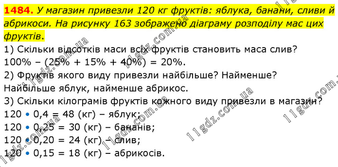 У магазин привезли 120 кг фруктів: яблука, банани, сливи й абрикоси. На рисунку 163 зображено діаграму розподілу мас цих фруктів. 1) Скільки відсотків маси всіх фруктів становить маса слив? 100% – (25% + 15% + 40%) = 20%. 2) Фруктів якого виду привезли найбільше? Найменше? Найбільше яблук, найменше абрикос. 3) Скільки кілограмів фруктів кожного виду привезли в магазин? 120 • 0,4 = 48 (кг) – яблук; 120 • 0,25 = 30 (кг) – бананів; 120 • 0,20 = 24 (кг) – слив; 120 • 0,15 = 18 (кг) – абрикосів.