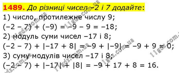 До різниці чисел –2 і 7 додайте: 1) число, протилежне числу 9; (–2 – 7) + (–9) = –9 – 9 = –18; 2) модуль суми чисел –17 і 8; (–2 – 7) + |–17 + 8| = –9 + |–9| = –9 + 9 = 0; 3) суму модулів чисел –17 і 8; (–2 – 7) + |–17| + |8| = –9 + 17 + 8 = 16.