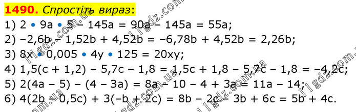 Спростіть вираз: 1) 2 • 9а • 5 – 145а = 90а – 145а = 55а; 2) –2,6b – 1,52b + 4,52b = –6,78b + 4,52b = 2,26b; 3) 8х • 0,005 • 4у • 125 = 20xy; 4) 1,5(с + 1,2) – 5,7с – 1,8 = 1,5c + 1,8 – 5,7c – 1,8 = –4,2c; 5) 2(4а – 5) – (4 – За) = 8a – 10 – 4 + 3a = 11a – 14; 6) 4(2b – 0,5с) + 3(–b + 2с) = 8b – 2c – 3b + 6c = 5b + 4c.
