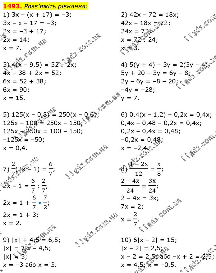 Розв’яжіть рівняння: 1) 3х – (х + 17) = –3; 3х – х – 17 = –3; 2х = –3 + 17; 2х = 14; х = 7. 2) 42х – 72 = 18х; 42х – 18х = 72; 24х = 72; х = 72 : 24; х = 3. 3) 4(х – 9,5) = 52 – 2х; 4х – 38 + 2х = 52; 6х = 52 + 38; 6х = 90; х = 15. 4) 5(у + 4) – 3у = 2(3у – 4); 5у + 20 – 3у = 6у – 8; 2у – 6у = –8 – 20; –4у = –28; у = 7. 5) 125(х – 0,8) = 250(х – 0,6); 125х – 100 = 250х – 150; 125х – 250х = 100 – 150; –125х = –50; х = 0,4. 6) 0,4(х – 1,2) – 0,2х = 0,4х; 0,4х – 0,48 – 0,2х = 0,4х; 0,2х – 0,4х = 0,48; –0,2х = 0,48; х = –2,4. 7) 2/7(2х – 1) = 6/7; 2х – 1 = 6/7 : 2/7; 2х = 1 + 6/7 • 7/2; 2х = 1 + 3; х = 2. 8) (1 - 2x)/12 = x/8; (2 - 4x)/24 = 3x/24; 2 – 4х = 3х; 7х = 2; х = 2/7. 9) |x| + 4,5 = 6,5; |x| = 7,5 – 4,5; |x| = 3; x = –3 або х = 3. 10) 6|x – 2| = 15; |x – 2| = 2,5; х – 2 = 2,5; або –х + 2 = 2,5; х = 4,5; х = –0,5.