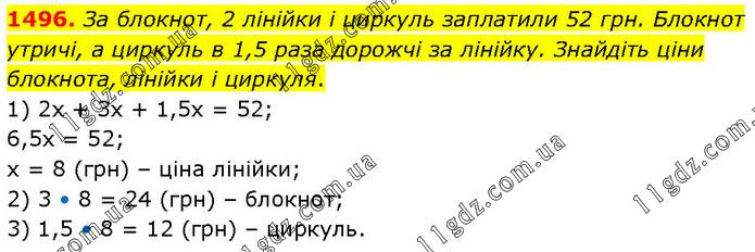За блокнот, 2 лінійки і циркуль заплатили 52 грн. Блокнот утричі, а циркуль в 1,5 раза дорожчі за лінійку. Знайдіть ціни блокнота, лінійки і циркуля. 1) 2х + 3х + 1,5х = 52; 6,5х = 52; х = 8 (грн) – ціна лінійки; 2) 3 • 8 = 24 (грн) – блокнот; 3) 1,5 • 8 = 12 (грн) – циркуль.