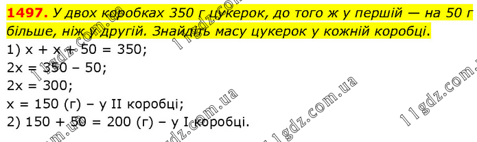 У двох коробках 350 г цукерок, до того ж у першій — на 50 г більше, ніж у другій. Знайдіть масу цукерок у кожній коробці. 1) х + х + 50 = 350; 2х = 350 – 50; 2х = 300; х = 150 (г) – у ІІ коробці; 2) 150 + 50 = 200 (г) – у І коробці.