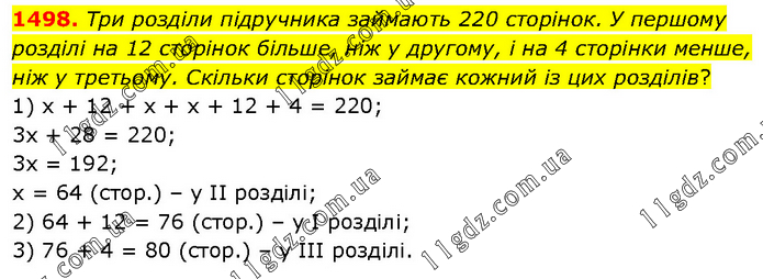 Три розділи підручника займають 220 сторінок. У першому розділі на 12 сторінок більше, ніж у другому, і на 4 сторінки менше, ніж у третьому. Скільки сторінок займає кожний із цих розділів? 1) х + 12 + х + х + 12 + 4 = 220; 3х + 28 = 220; 3х = 192; х = 64 (стор.) – у ІІ розділі; 2) 64 + 12 = 76 (стор.) – у І розділі; 3) 76 + 4 = 80 (стор.) – у ІІІ розділі.