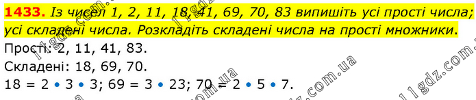 Із чисел 1, 2, 11, 18, 41, 69, 70, 83 випишіть усі прості числа; усі складені числа. Розкладіть складені числа на прості множники. Прості: 2, 11, 41, 83. Складені: 18, 69, 70. 18 = 2 • 3 • 3; 69 = 3 • 23; 70 = 2 • 5 • 7.