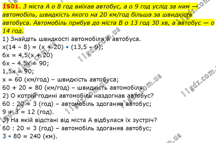 З міста А о 8 год виїхав автобус, а о 9 год услід за ним — автомобіль, швидкість якого на 20 км/год більша за швидкість автобуса. Автомобіль прибув до міста В о 13 год 30 хв, а автобус — о 14 год. 1) Знайдіть швидкості автомобіля й автобуса. х(14 – 8) = (х + 20) • (13,5 – 9); 6х = 4,5(х + 20) 6х – 4,5х = 90; 1,5х = 90; х = 60 (км/год) – швидкість автобуса; 60 + 20 = 80 (км/год) – швидкість автомобіля. 2) O котрій годині автомобіль наздогнав автобус? 60 : 20 = 3 (год) – автомобіль здоганяв автобус; 9 + 3 = 12 (год). 3) На якій відстані від міста А відбулася їх зустріч? 60 : 20 = 3 (год) – автомобіль здоганяв автобус; 3 • 80 = 240 (км).