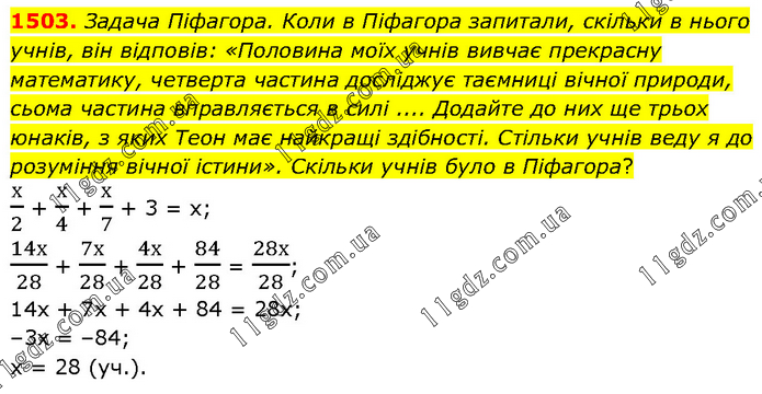Задача Піфагора. Коли в Піфагора запитали, скільки в нього учнів, він відповів: «Половина моїх учнів вивчає прекрасну математику, четверта частина досліджує таємниці вічної природи, сьома частина вправляється в силі .... Додайте до них ще трьох юнаків, з яких Теон має найкращі здібності. Стільки учнів веду я до розуміння вічної істини». Скільки учнів було в Піфагора? х/2 + х/4 + х/7 + 3 = х; 14х/28 + 7х/28 + 4х/28 + 84/28 = 28х/28; 14х + 7х + 4х + 84 = 28х; –3х = –84; х = 28 (уч.).