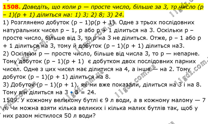 Доведіть, що коли р — просте число, більше за 3, то число (р – 1)(р + 1) ділиться на: 1) 3; 2) 8; 3) 24. 1) Розглянемо добуток (р – 1)р(р + 1). Одне з трьох послідовних натуральних чисел р – 1, р або р + 1 ділиться на 3. Оскільки р –просте число, більше від 3, то р на 3 не ділиться. Отже, р – 1 або р + 1 ділиться на 3, тому й добуток (р – 1)(р + 1) ділиться на3. 2) Оскільки р — просте число, більше від числа 3, то р — непарне. Тому добуток (р – 1)(р + 1) є добутком двох послідовних парних чисел. Одне з цих чисел має ділитися на 4, а інше — на 2. Тому добуток (р – 1)(р + 1) ділиться на 8. 3) Добуток (р – 1)(р + 1), як ми вже показали, ділиться на 3 і на 8. Тому він ділиться на 3 • 8 = 24. 1509. У кожному великому бутлі є 9 л води, а в кожному малому — 7 л. Чи можна взяти кілька великих і кілька малих бутлів так, щоб у них разом містилося 50 л води?