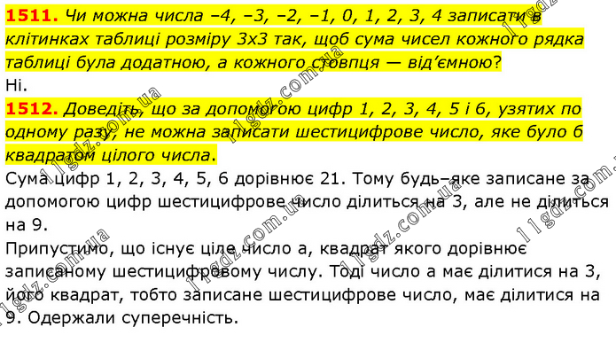 1511. Чи можна числа –4, –3, –2, –1, 0, 1, 2, 3, 4 записати в клітинках таблиці розміру 3x3 так, щоб сума чисел кожного рядка таблиці була додатною, а кожного стовпця — від’ємною? Ні. 1512. Доведіть, що за допомогою цифр 1, 2, 3, 4, 5 і 6, узятих по одному разу, не можна записати шестицифрове число, яке було б квадратом цілого числа. Сума цифр 1, 2, 3, 4, 5, 6 дорівнює 21. Тому будь–яке записане за допомогою цифр шестицифрове число ділиться на 3, але не ділиться на 9. Припустимо, що існує ціле число a, квадрат якого дорівнює записаному шестицифровому числу. Тоді число a має ділитися на 3, його квадрат, тобто записане шестицифрове число, має ділитися на 9. Одержали суперечність.