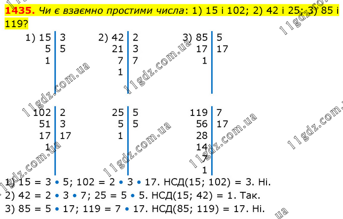 Чи є взаємно простими числа: 1) 15 і 102; 2) 42 і 25; 3) 85 і 119? 1) 15 = 3 • 5; 102 = 2 • 3 • 17. НСД(15; 102) = 3. Ні. 2) 42 = 2 • 3 • 7; 25 = 5 • 5. НСД(15; 42) = 1. Так. 3) 85 = 5 • 17; 119 = 7 • 17. НСД(85; 119) = 17. Ні.