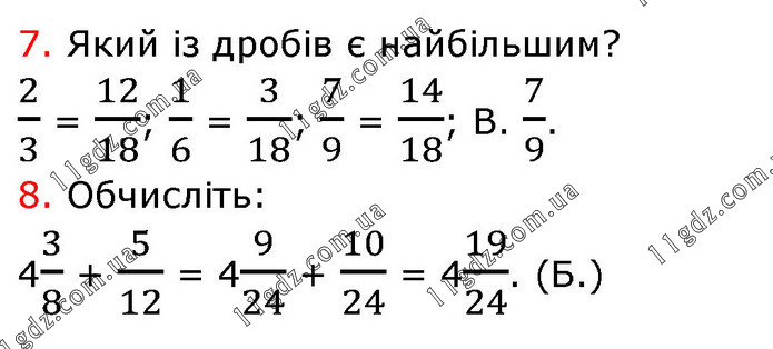 7. Який із дробів є найбільшим? 2/3 = 12/18; 1/6 = 3/18; 7/9 = 14/18; В. 7/9. 8. Обчисліть: 43/8 + 5/12 = 49/24 + 10/24 = 419/24. (Б.)