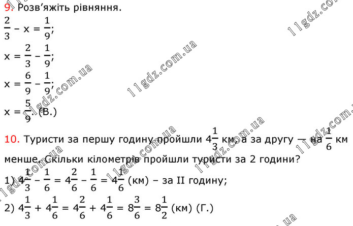 9. Розв’яжіть рівняння. 2/3 – х = 1/9; х = 2/3 – 1/9; х = 6/9 – 1/9; х = 5/9. (В.) 10. Туристи за першу годину пройшли 41/3 км, а за другу — на 1/6 км менше. Скільки кілометрів пройшли туристи за 2 години? 1) 41/3 – 1/6 = 42/6 – 1/6 = 41/6 (км) – за ІІ годину; 2) 41/3 + 41/6 = 42/6 + 41/6 = 83/6 = 81/2 (км) (Г.)