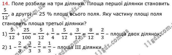 Поле розбили на три ділянки. Площа першої ділянки становить 5/12, а другої — 25 % площі всього поля. Яку частину площі поля становить площа третьої ділянки? 1) 5/12 + 25/100 = 5/12 + 1/4 = 5/12 + 3/12 = 8/12 = 2/3 – площа двох ділянок; 2) 1 – 2/3 = 3/3 – 2/3 = 1/3 – площа ІІІ ділянки.