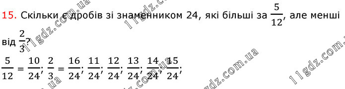 Скільки є дробів зі знаменником 24, які більші за 5/12, але менші від 2/3? 5/12 = 10/24; 2/3 = 16/24; 11/24; 12/24; 13/24; 14/24; 15/24;