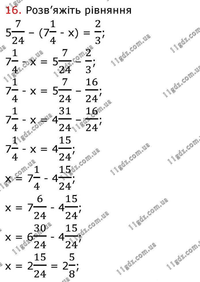 Розв’яжіть рівняння 57/24 – (71/4 - х) = 2/3; 71/4 - х = 57/24 – 2/3; 71/4 - х = 57/24 – 16/24; 71/4 - х = 431/24 – 16/24; 71/4 - х = 415/24; х = 71/4 - 415/24; х = 76/24 - 415/24; х = 630/24 - 415/24; х = 215/24 = 25/8;
