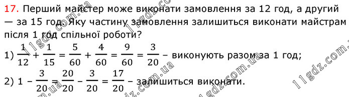 Перший майстер може виконати замовлення за 12 год, а другий — за 15 год. Яку частину замовлення залишиться виконати майстрам після 1 год спільної роботи? 1) 1/12 + 1/15 = 5/60 + 4/60 = 9/60 = 3/20 – виконують разом за 1 год; 2) 1 – 3/20 = 20/20 – 3/20 = 17/20 – залишиться виконати.