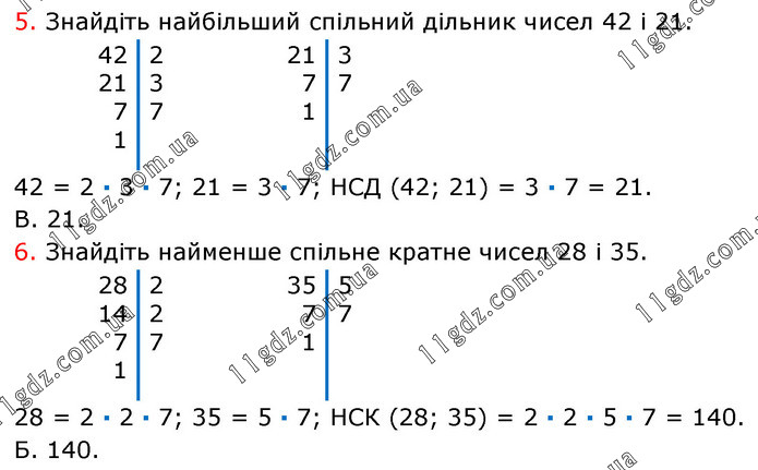 5. Знайдіть найбільший спільний дільник чисел 42 і 21. 42 = 2 · 3 · 7; 21 = 3 · 7; НСД (42; 21) = 3 · 7 = 21. В. 21. 6. Знайдіть найменше спільне кратне чисел 28 і 35. 28 = 2 · 2 · 7; 35 = 5 · 7; НСК (28; 35) = 2 · 2 · 5 · 7 = 140. Б. 140.
