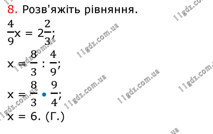 8. Розв'яжіть рівняння. 4/9х = 22/3; х = 8/3 : 4/9; х = 8/3 • 9/4; х = 6. (Г.)