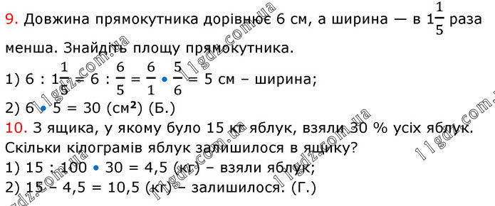 9. Довжина прямокутника дорівнює 6 см, а ширина — в 11/5 раза менша. Знайдіть площу прямокутника. 1) 6 : 11/5 = 6 : 6/5 = 6/1 • 5/6 = 5 см – ширина; 2) 6 • 5 = 30 (см2) (Б.) 10. З ящика, у якому було 15 кг яблук, взяли 30 % усіх яблук. Скільки кілограмів яблук залишилося в ящику? 1) 15 : 100 • 30 = 4,5 (кг) – взяли яблук; 2) 15 – 4,5 = 10,5 (кг) – залишилося. (Г.)